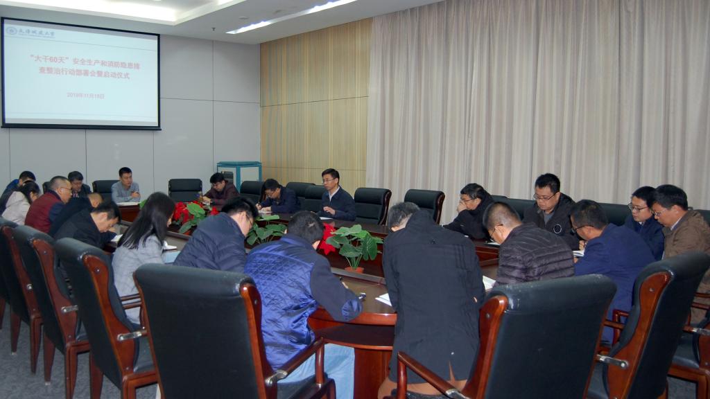 为深入贯彻落实习近平总书记关于安全生产重要指示批示精神,扎实做好校园安全生产和消防隐患排查整治工作,确保2020年寒假和元旦、春节“两节”期间校园持续保持平安稳定,11月19日上午,学校在现代教育中心会议室召开“大干60天”安全生产和消防隐患排查整治行动部署会暨启动仪式。校党委常委、副校长胡志刚出席并宣布“大干60天”安全生产和消防隐患排查整治行动启动,学校安全生产工作领导小组成员单位、部门有关负责同志参加会议。
