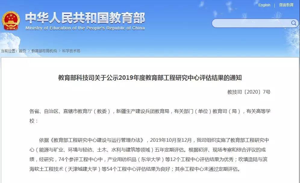 2019年10月至12月,教育部科学技术司依据《教育部工程研究中心建设与运行管理办法》,组织实施了教育部工程研究中心(能源与矿业、环境与轻纺、土木、水利与建筑等领域)五年定期评估。根据初评、现场考察和综合评议的成绩,74个参评工程中心中,产业用纺织品(东华大学)等12个工程中心评估结果为优秀;吹填造陆与滨海软土工程技术(天津城建大学)等54个工程中心评估结果为良好;其余工程中心未通过定期评估。