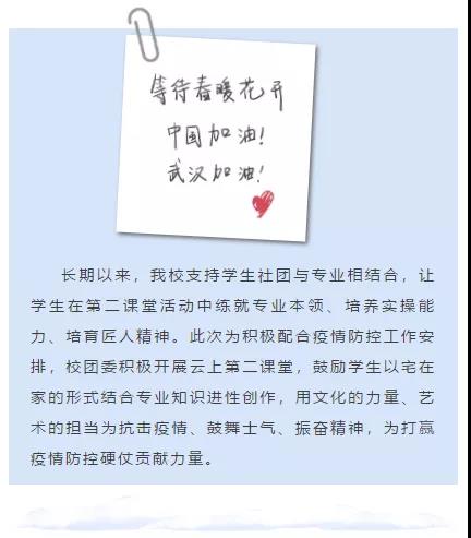为坚决打赢疫情防控狙击战,展现时代青年担当,传递浓浓真情爱意。我校敲响云上第二课堂上课铃,发起“凝青聚力,战‘疫’有我,在家充当网络宣传员”主题活动。号召青年学生在疫情特殊时期在家单独完成创作,拍摄暖心视频、上传战“疫”脑洞作品、支招“宅”家解闷方法。