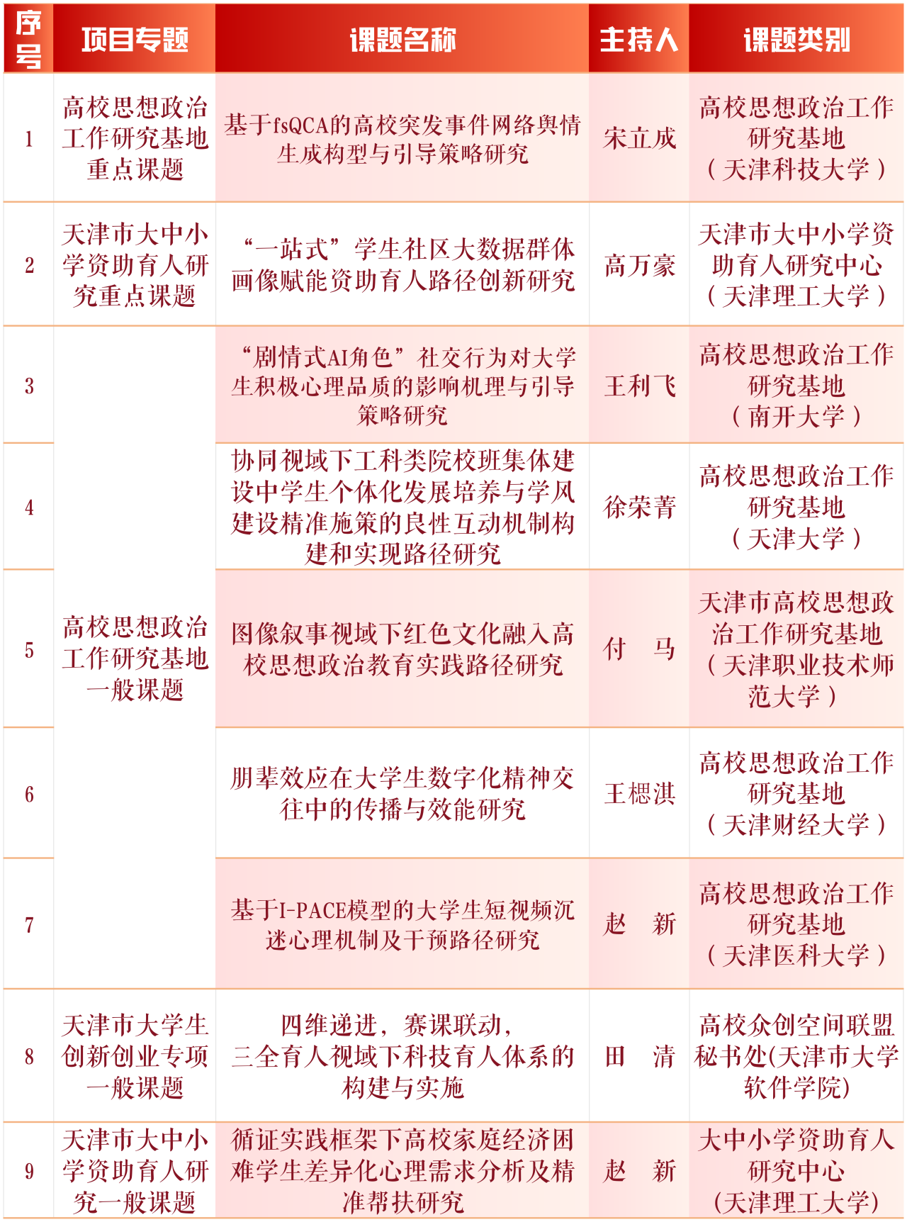 近日,市教育两委公布了2024年天津市大中小思想政治工作专项课题结项和2025年大中小思想政治工作专项课题立项名单。经专家组评审,我校7项课题顺利结项;在2025年度大中小思想政治工作专项课题中,9项课题成功获批立项,其中重点课题2项,一般课题7项。