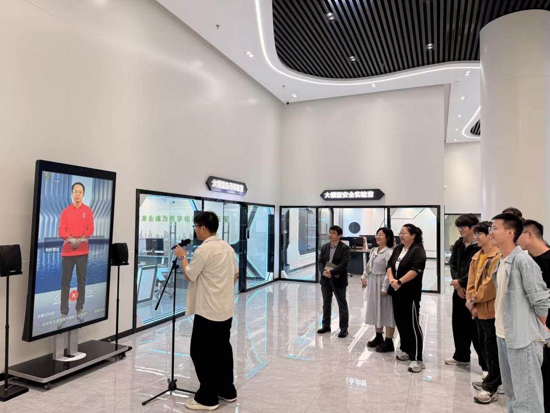 参观过程中,同学们驻足在360集团创始人周鸿祎先生的数字人屏幕前,体验与数字人互动,向数字人提出了不同编程语言在企业实践中的应用场景,以及计算机类专业的未来求职方向等问题,都得到了有针对性的解答。