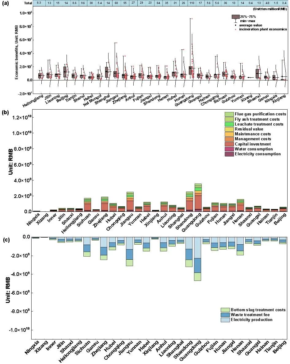 该研究基于全国876座垃圾焚烧厂的真实运行数据,首次对我国生活垃圾焚烧行业全链条下的各项处理环节进行了环境与经济的综合评估,并通过情景模拟揭示了区域污染物治理与资源化利用的协同增效潜力。