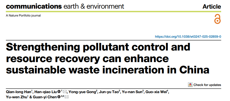 近日,我校能源与安全工程学院刘汉桥教授联合天津商业大学陈冠益教授在城市固废资源化与减污降碳领域取得重要进展。相关成果于2025年10月以Article形式发表于《Nature》旗下期刊Communications Earth & Environment,题目为“Strengthening pollutant control and resource recovery can enhance sustainable waste incineration in China”。