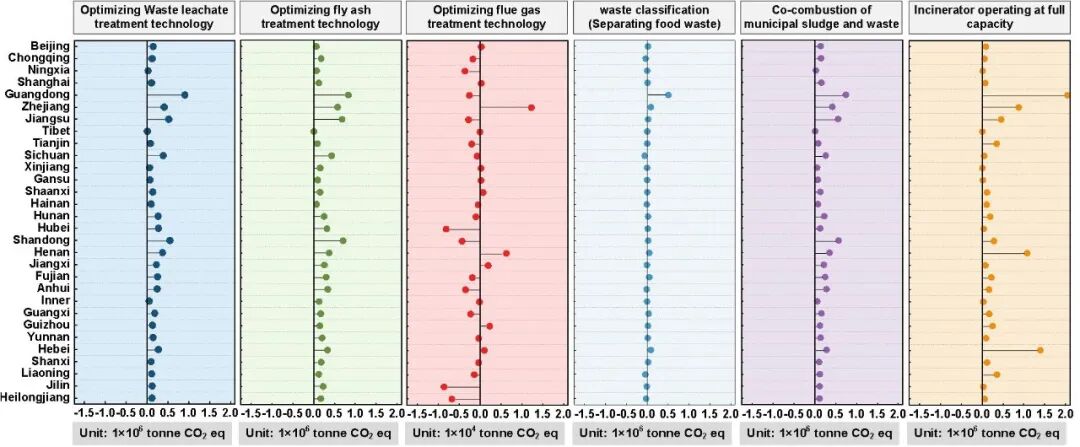 图4. 省级垃圾焚烧行业不同优化策略下的碳减排潜力