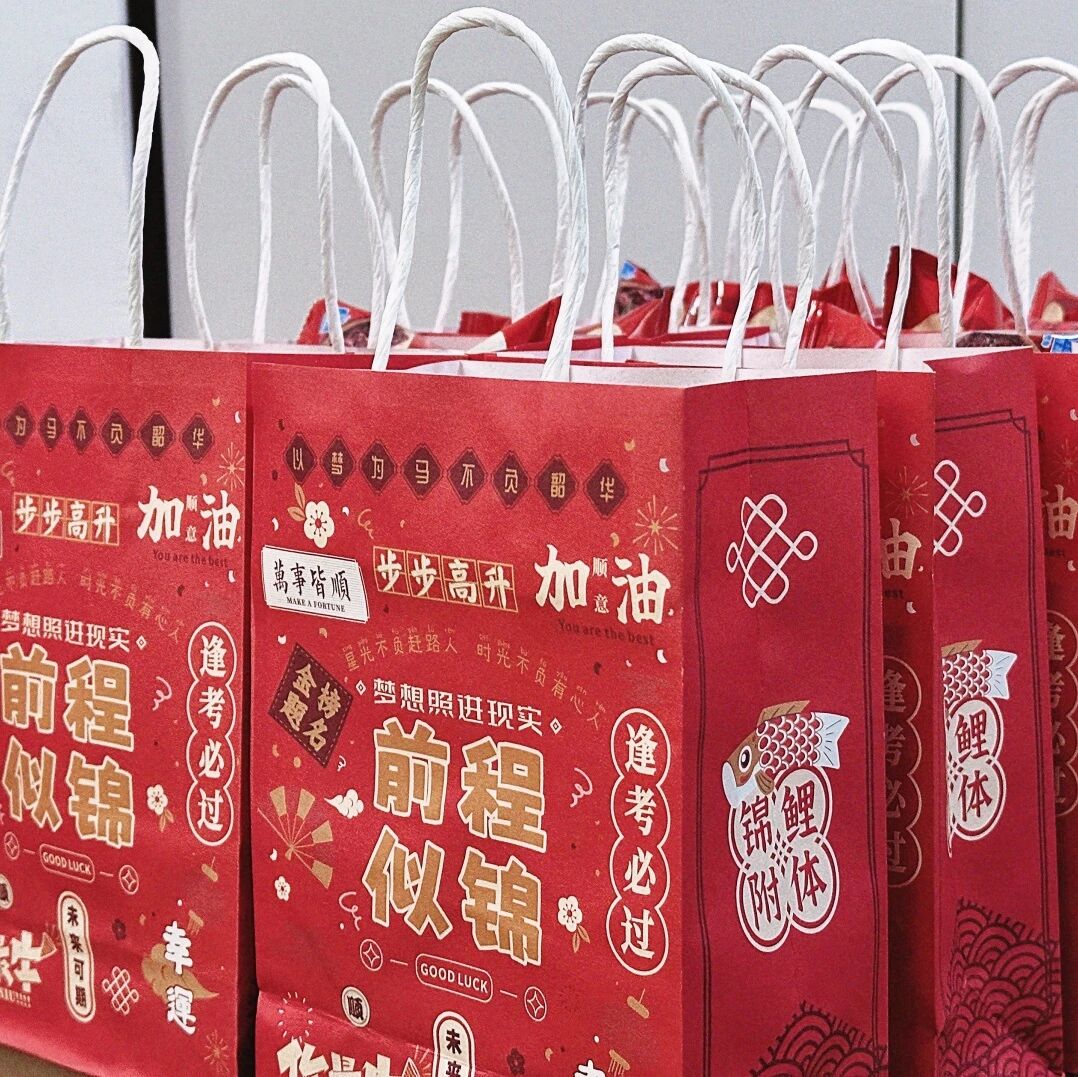 建筑学院将祝福融入实用好礼之中。暖手宝寓意“研”途温心,“连中三元”文具套装寄托下笔从容、金榜题名的期许,蒸汽眼罩助力学子明眸亮眼、思如泉涌。每一份伴手礼都搭配手写祝福书签,一字一句,皆是对学子落笔生花的殷殷期盼与美好祝福。