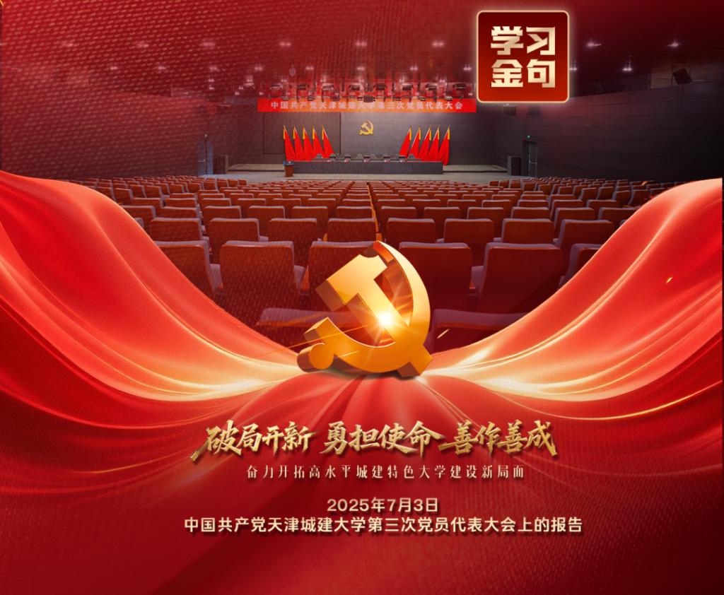 7月3日,中国共产党天津城建大学第三次党员代表大会隆重开幕,大会的主题是高举中国特色社会主义伟大旗帜,坚持以习近平新时代中国特色社会主义思想为指导,深入贯彻落实党的二十大和二十届二中、三中全会以及市第十二次党代会精神和全国、全市教育大会精神,贯彻党的教育方针,落实立德树人根本任务,深化教育改革,统筹推进教育发展、科技创新、人才培养,破局开新、勇担使命、善作善成,奋力开拓高水平城建特色大学建设新局面,为教育强国建设贡献智慧和力量!校党委书记史庆伟同志作题为《破局开新 勇担使命 善作善成 奋力开拓高水平城建特色大学建设新局面》的报告。