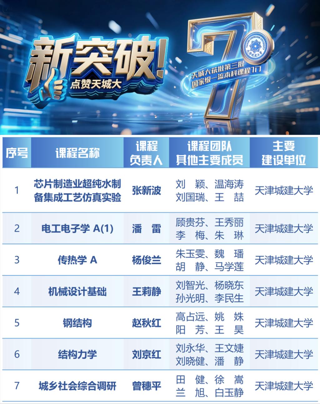 我校7门课程成功入选国家级一流本科课程,在天津市市属院校中名列前茅。其中,虚拟仿真实验教学课程1门、线上线下混合式课程3门、线下课程2门、社会实践课程1门。目前,我校获批国家级一流本科课程总数已达12门,标志着学校在本科课程建设领域的核心竞争力与人才培养质量实现阶段性跃升。