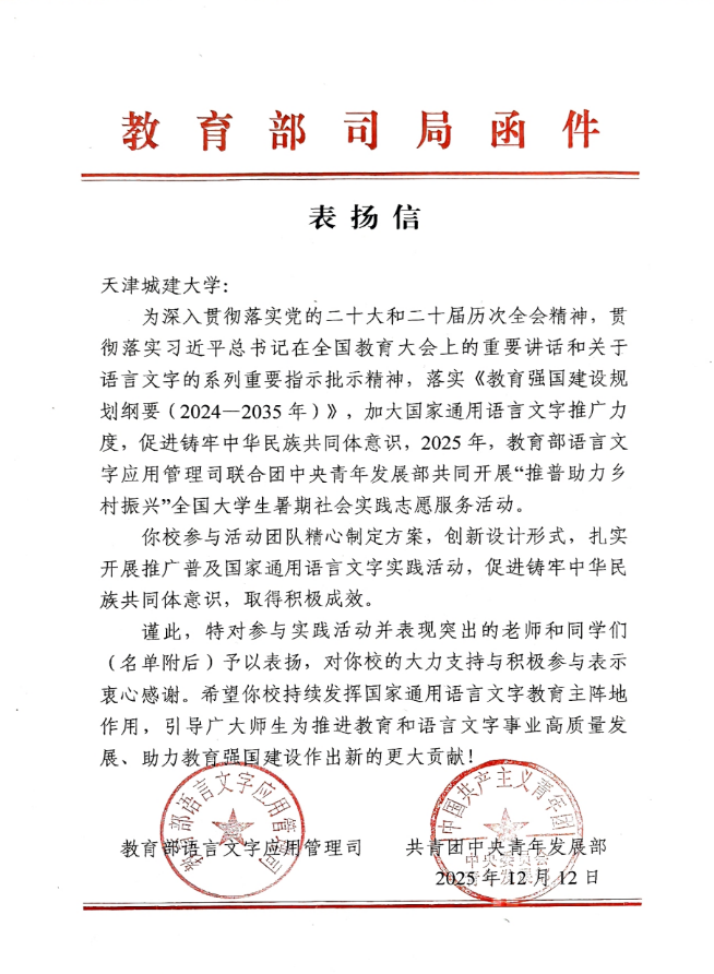 近日,教育部语言文字应用管理司与共青团中央青年发展部联合发文,对2025年“推普助力乡村振兴”全国大学生暑期社会实践志愿服务活动优秀团队予以通报表扬。我校国际工程学院“雨润陕甘,红韵传声”实践团凭借扎实的实践成效和突出的社会贡献,从全国2000支参评团队中脱颖而出,斩获全国“优秀团队”称号。
