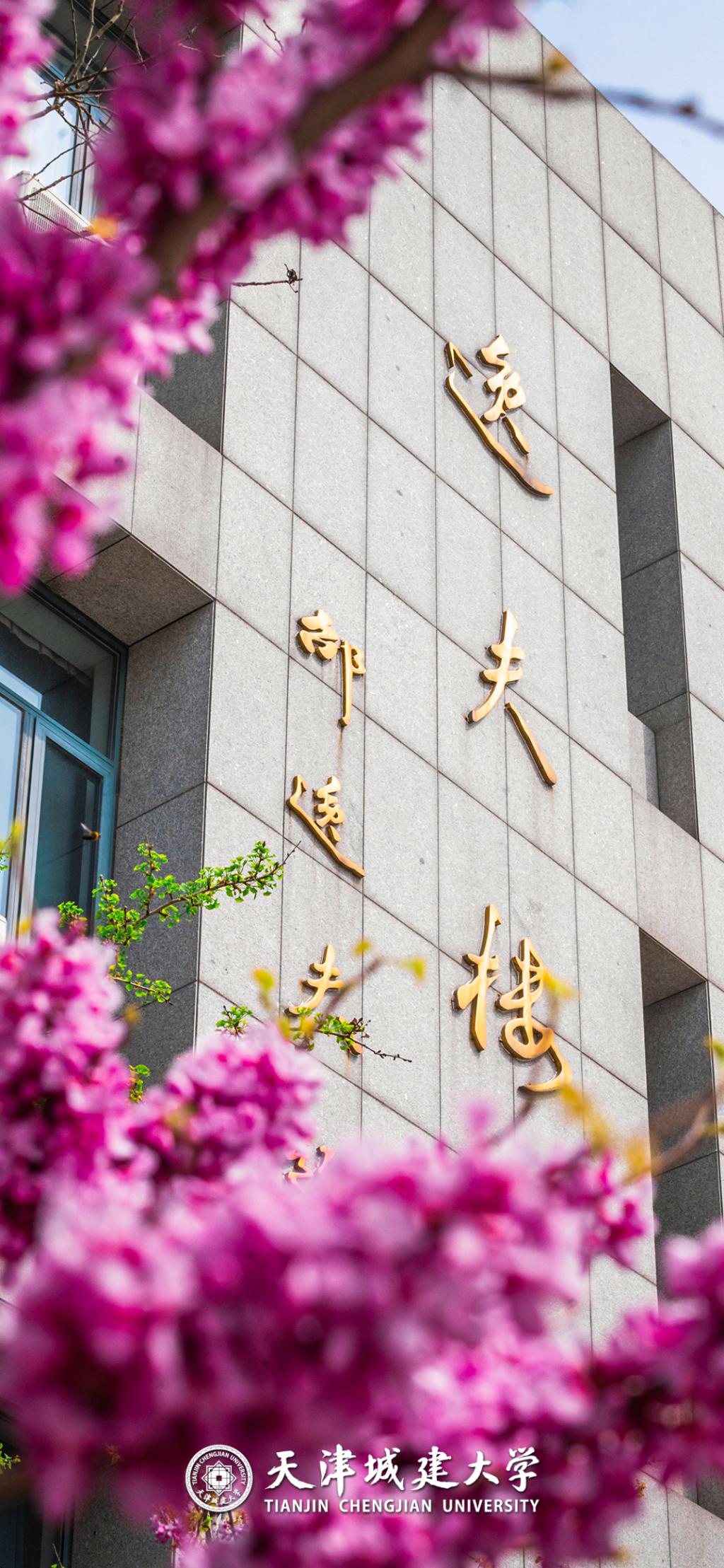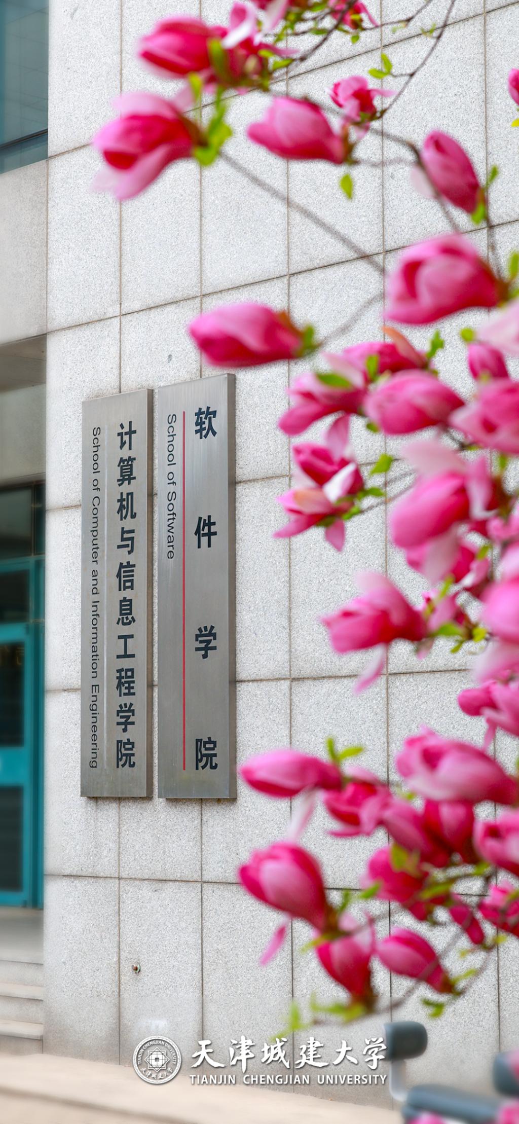 把粉红花苞,轻轻缀在计算机学院的墙前