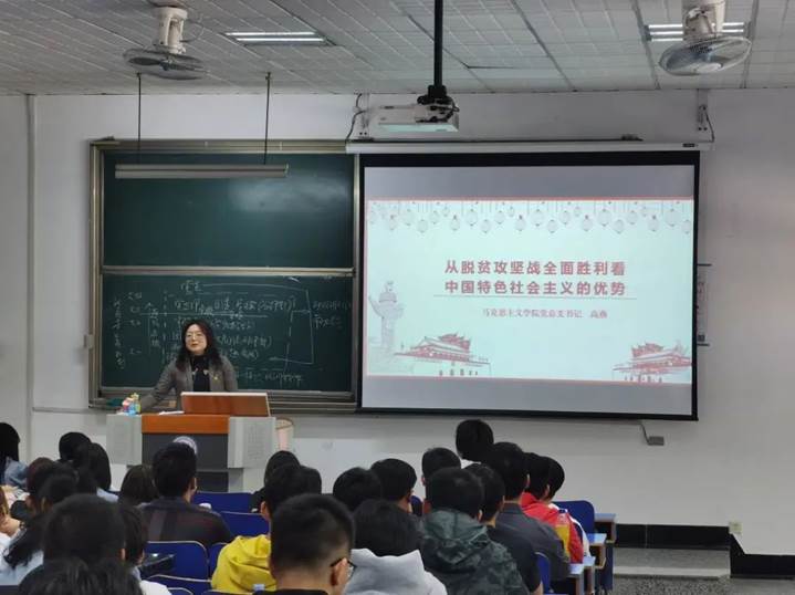 高燕围绕一部中国史就是一部中华民族同贫困作斗争的历史、中国共产党人的初心和使命、贫穷不是社会主义等3方面内容,以8年来脱贫攻坚中涌现的大量英雄事迹、脱贫攻坚战系列数据等讲述了在中国共产党的坚强领导下,以习近平新时代中国特色社会主义思想为指导带领全国各族人民打赢脱贫攻坚战的不懈奋斗史。她提出,一个党员一面旗帜,学生党员始终要弘扬理论与实践相结合的作风,增强政治自觉,把握历史发展规律,发挥统一思想、传递目标、达成共识,在培育文化氛围方面发挥先锋模范作用。