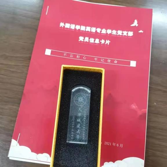 首先,学生支部负责人带领全体党员进行入党宣誓,重温入党誓词,进一步坚定理想信念。随后,为毕业生党员代表颁发党员信息卡。党员信息上记录了该党员的申请入党时间、入党时间、入党介绍人等信息以及复印的入党申请书、入党志愿书,勉励各位毕业生党员要时刻谨记自己的党员身份。毕业班党员拿着党员信息卡片,重温自己的入党故事,重忆入党初心,并给低年级党员提出期许。而后,由低年级党员为毕业班党员送上支部纪念品-带有校徽标志的个人印章,并送上祝福,希望毕业班党员前程似锦,广阔舞台大有作为。
